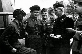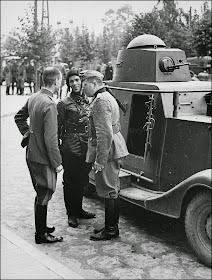 | Батальонный комиссар 29-й танковой бригады Красной Армии В. Ю. Боровицкий с немецкими офицерами у бронеавтомобиля БА-20 в Брест-Литовске. |