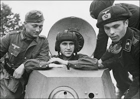 | Солдаты вермахта с красноармейцем на советском бронеавтомобиле БА-20 из 29-й отдельной танковой бригады в городе Брест-Литовск. Bundesarchiv. "Bild 101I-121-0008-13" |